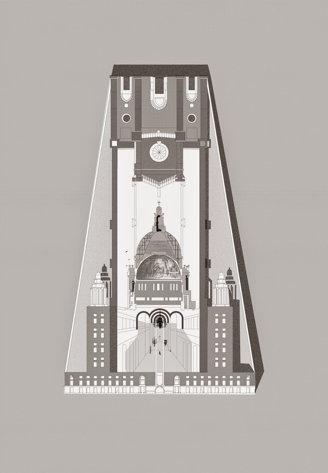 This drawing was inspired from chapter 9 of the book - The Cathedral. Here I was trying to show all faces of the cathedral in one drawing - another experiment with the 2,3 dimensional effects which gives the drawing that feel which has been strongly presented in Kafka's writings. The front facade was taken from the site context where this building is taking place - borrowing elements from the site to complete the overall scheme of the journey. This will be the main focus in the next stage to develop the rest of the drawings as the scheme blends in with the site surroundings.